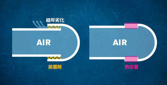 私たちは数年に渡り、破損した自・他社製のインフレータブルSUPボードの修繕と調査を行ってきました。そこで判明したのは、インフレータブルSUPボードの破損のほとんどは接着剤の劣化に起因するマテリアルの剥がれでした。残念ながら接着剤は経年劣化する性質があり、BRAVO!ではこの根本的な問題を解決する為に、熱によりマテリアル同士を融解結合する「熱圧着技術」を採用し、空気漏れのリスクを最小限に留めました。