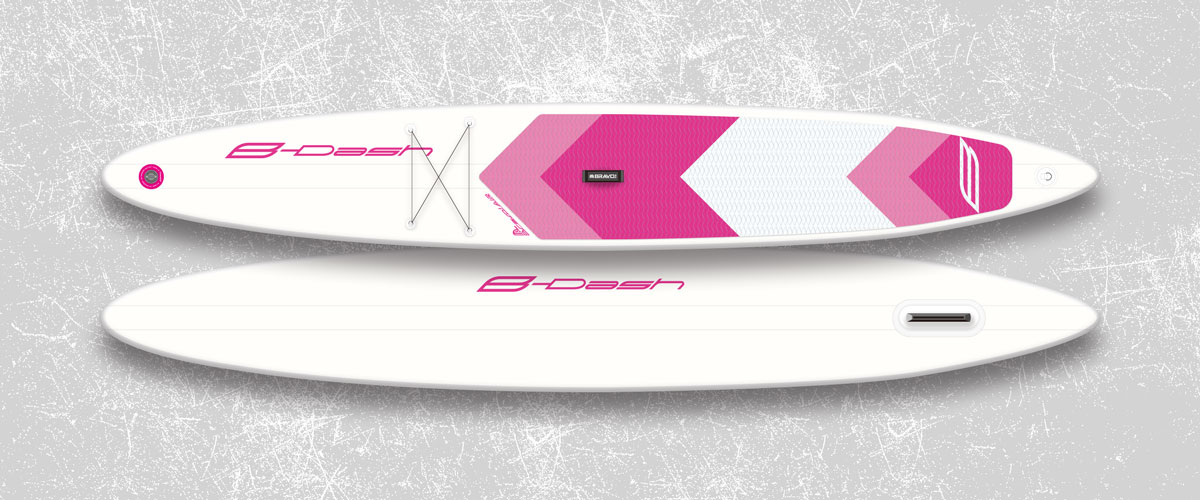 「B-Series」ではSUPボードの強度の向上と軽量化を目指す上で、構造とマテリアルの見直しを一から行いました。このシリーズでは、軽量、かつ強化したドロップステッチを採用し、同時にマテリアル数を減らす事で軽量化に成功しました。中でもフラッグシップモデルの14ft競技艇「B-Dash 25」では、重量がわずか9.8kgしかありません。このモデルは軽量であるにも関わらず、ボードのセンターに骨格補強を施し、強靭性の強化を行っています。軽さと強さを兼ね備えたボードだと言えるでしょう。