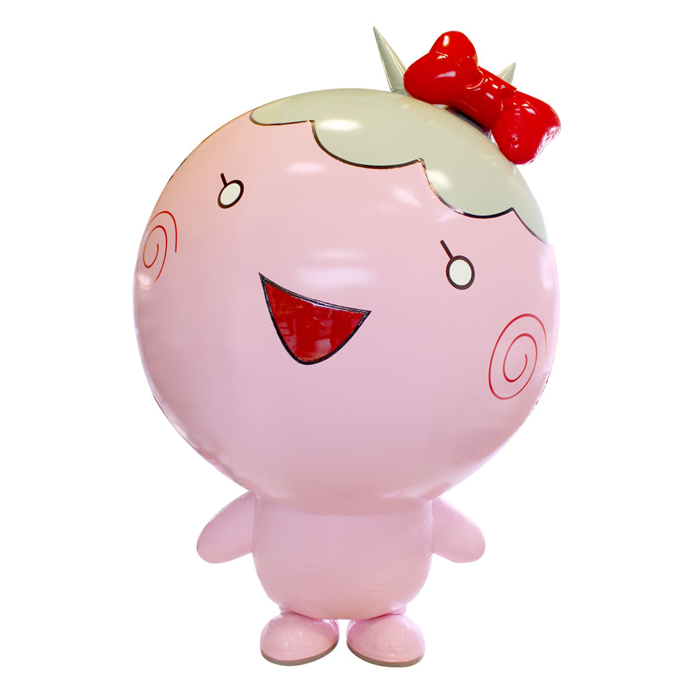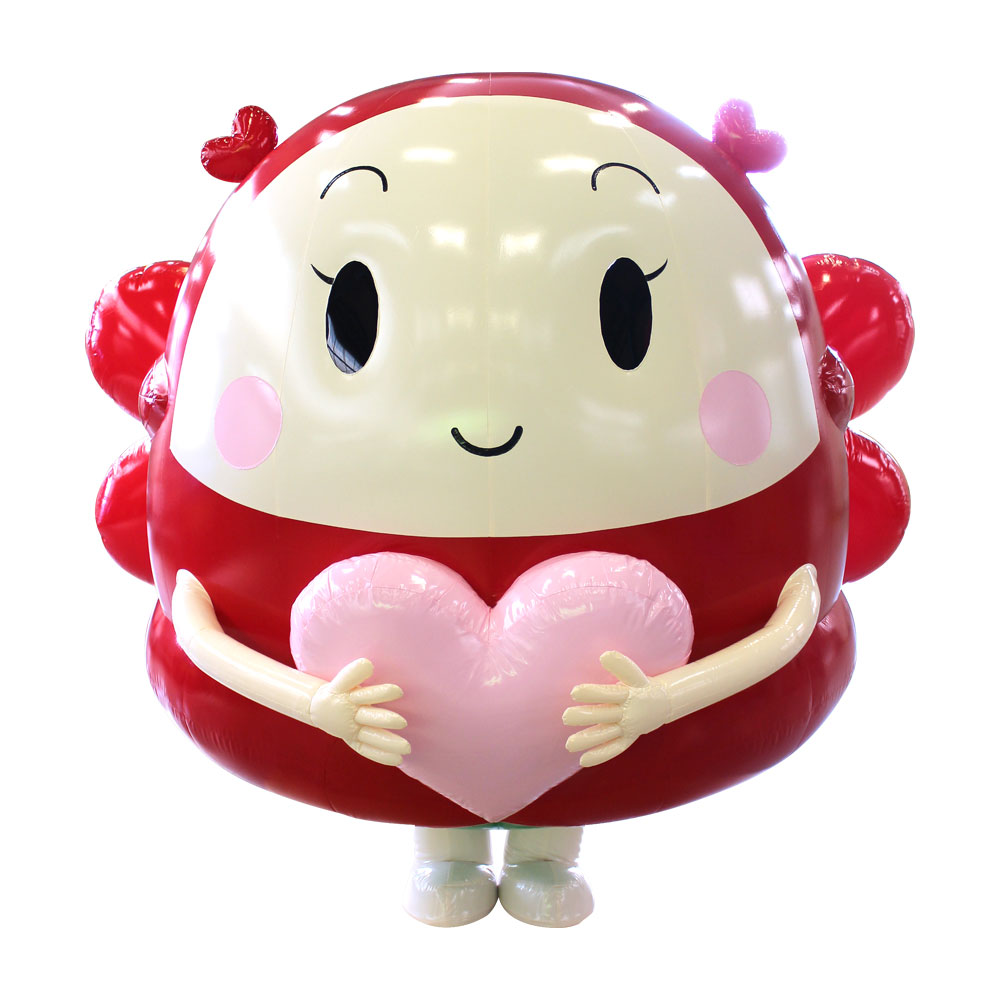 インフレータブル式の着ぐるみバルーンは特殊な生地を縫い合わせ、小型送風機にてエアーを入れることによりその形状を維持します。一番の特徴は着ぐるみ内部にエアーが循環するため、通気性がよいという点です。直接、体に密着する部分が少ないため衛生面も安心、汚れた場合は洗濯で丸洗いも可能です。また複雑な形状も表現でき、収納、運搬面でも通常の着ぐるみとは違い、非常に優れています。